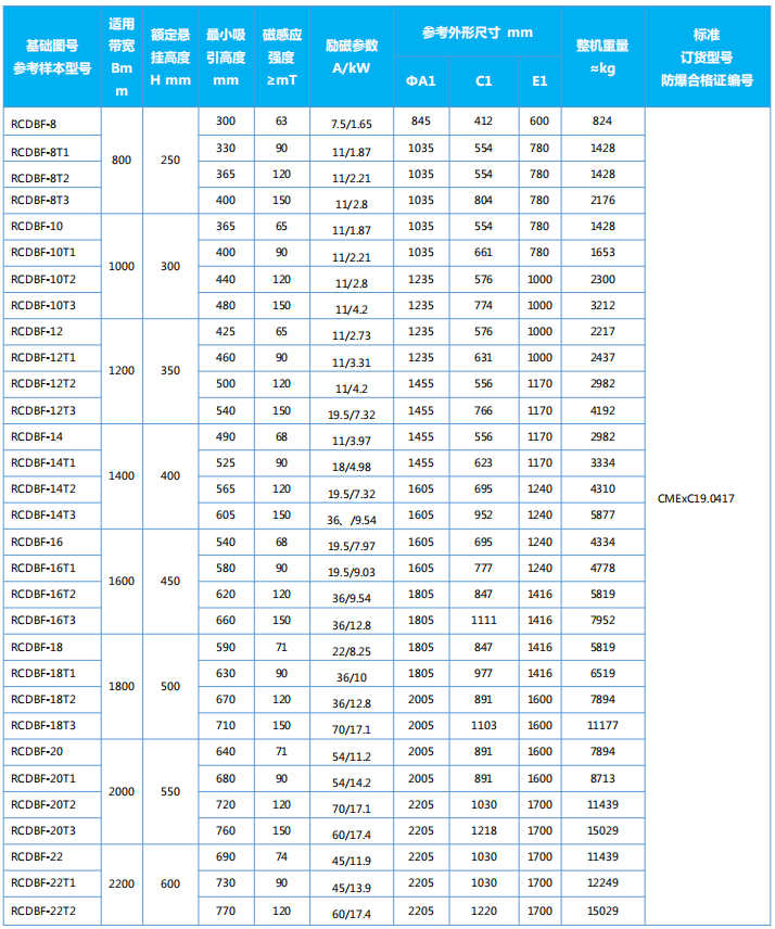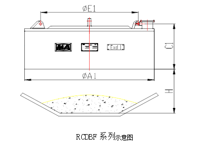 四、RCDBF系列粉塵防爆型盤式電磁除鐵器主要技術參數、外形尺寸